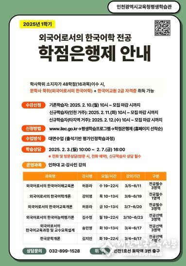 [대한민국교육신문] 인천광역시교육청평생학습관에서는 2025년 1학기 학점은행제 학습자를 모집한다.
