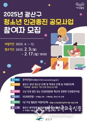 [대한민국교육신문] 광주 광산구가 시민의 청소년 인권 향상 활동을 지원하는 ‘2025년 광산구 청소년 인권 증진 공모사업’을 추진한다.