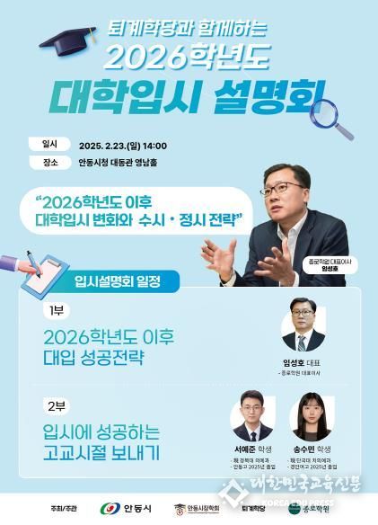 [대한민국교육신문] 안동시장학회와 퇴계학당이 주최하고 ㈜종로아카데미가 주관하는 ‘2026학년도 대학입시 설명회’가 오는 2월 23일 시청 대동관 영남홀에서 개최된다.