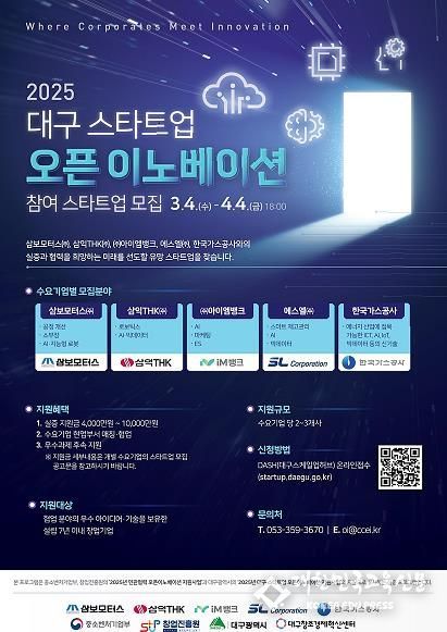 [대한민국교육신문] 대구광역시는 지역의 선도기업 5개사와 스타트업의 기술협력을 통한 동반성장을 지원하는 ‘2025년 대구 스타트업 오픈이노베이션 지원사업’에 참여를 희망하는 스타트업을 모집한다.