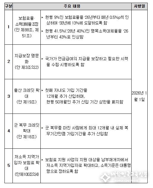 개정된 국민연금법은 하위법령 마련 등을 거쳐 2026년 1월 1일부터 시행된다.