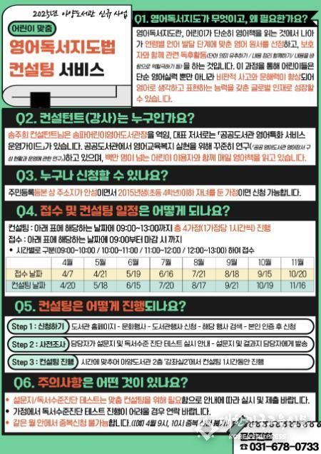 [대한민국교육신문] 안성시 아양도서관은 2025년 4월부터 11월까지 초등학생 4학년 이하의 자녀를 둔 가정을 대상으로 자녀 맞춤형 영어독서 지도법 컨설팅 서비스를 운영한다. 영어독서지도란, 아이들의 연령별 언어 발달 단계에 맞는 영어 원서 선정 및 보호자와 함께 하는 독후 활동을 통해 영어로 생각하고 표현하는 능력을 가질 수 있는 영어 학습법이다.