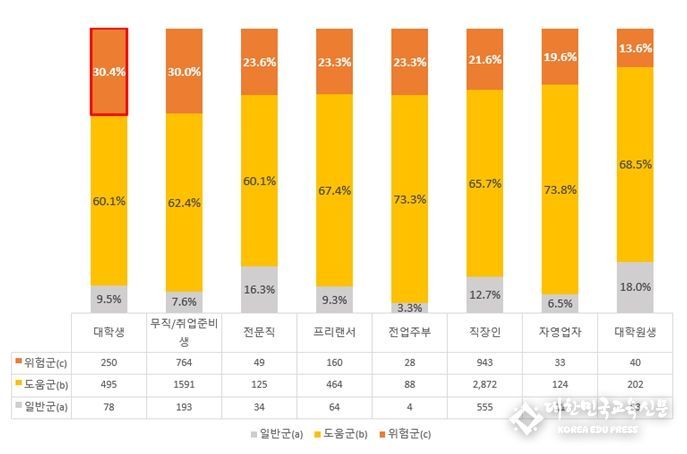 지난해 ‘청년 마음건강 지원사업’ 참여자 대상 간이정신건강진단검사(KSCL95)를 직업군별로 분석한 결과, 동일 집단 내 고위험 비율은 대학생(30.4%), 무직/취업준비생(30.0%) 순으로 높았다. 청소년에서 성인으로 이행하는 과도기의 대학생들이 진로, 취업, 대인관계, 삶의 방향 설정 등 다양한 이유로 심리적 위기를 겪고 있는 것으로 보인다.