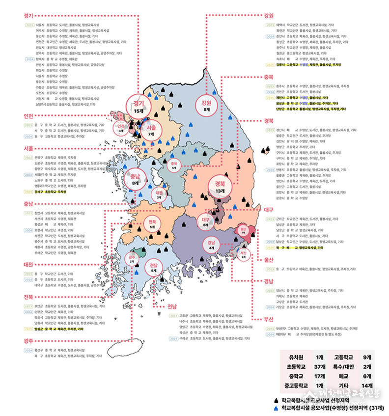 특히, 충북 음성군의 무극중학교 학교복합시설 건립 사업은 수영장, 자기주도 학습공간, 늘봄교실, 주차장 등의 설치를 통해 학생 교육환경을 개선하고 지역 주민을 위한 생활 인프라(기반시설)를 구축한다. 이를 통해 인구유출 방지와 지역균형 발전에 기여할 수 있을 것으로 기대된다.