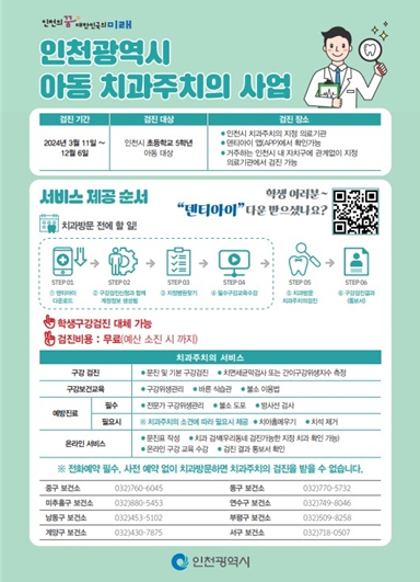 [대한민국교육신문] 인천광역시는 3월 11일부터 12월 6일까지 관내 초등학교 5학년을 대상으로 아동 치과주치의 사업을 실시한다고 밝혔다.