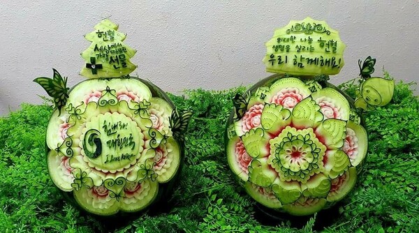 과일이나 야채를 그냥 못 먹어요. 그냥 먹으면 안 될것 같고 무언가 해야할것 같아서요. 행사하고난 작품은 관계자들에게 선물하구요. 행사외에 수업으로 수박을 조각하면 저는 못 먹겠더라구요. 공들여 만든게 아깝기도 하고 다른분에게 선물하고 싶어서 ㅎㅎ. 그래서 우리 식구들은 되려 수박을 잘 못 얻어먹고, 나눔을 많이 하지요! 그리고 작품을 할땐 항상 이건 누구를 드릴까 생각하며 조각해요.