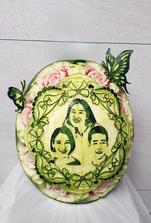 저는 수박을 좋아해요. 과일중에 가장 크고 세가지 색상(초록,흰색,빨간색)이 있어서 표현할수 있는게 많아요. 글씨,그림,얼굴까지 조각할수 있고,여러가지 꽃과 멋진 문양들도 표현할수 있고, 작품을 했을 때 가장 화려하답니다. 행사든 주문이든 선물이든 어느때나 수박카빙을 제일 많이 하는 것 같아요. 지금까지 수박만 600통이상 조각했어요.