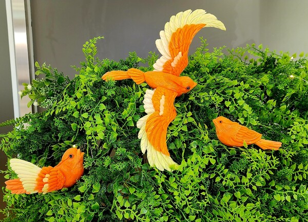 동물은 새 종류가 좋아요. 참새나 백조, 학같은 작품은 결혼식이나 파티,어느 행사에도 잘 어울리고 가장 많이 조각한거 같아요. 재료도 무우나 당근으로 만드니 쉽게 구할수 있구요. 당근으로 만든 용도 행사에 많이 쓰지만, 교회 행사처럼 원치 않는곳도 있어서 ,무난한건 새 종류인거 같아요. 만들어 놨을때 신기해 하시고 귀엽기도 하구요.
