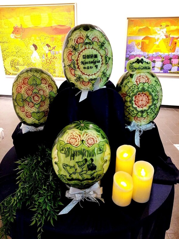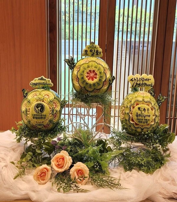 어느 교수님의 미술 전시회에 오프닝 세팅을 해드렸었는데 교수님의 메인 작품을 수박에 새겨드렸었거든요. 전시회가 마치고 교수님께서 너무 아까운데 이걸 어떻게 보관할 수 있을까? 하시다가 낙관 찍듯이 수박작품에다 먹을 묻혀서 찍으셨대요. 교수님의 멋진 작품과 함께 그것을 제게도 선물로 주셨어요! 미국에 계신 한분이 파킨슨병이셨는데 볼펜을 잡고 글 쓰기도 어려우셨거든요~ 그런데 카빙 특강에 오셔서 칼을 잡고 수박카빙을 하셨어요! 수박에 글씨 새기는것도 가르쳐 드렸더니 본인 이름을 수박에 새겨와서 작품과 함께 전시회까지 하셨답니다. 작품도 얼마나 예쁘게 하셨는지 본인, 남편, 주위분들 모두가 감동이었어요! 제가 7년전에 KBS 생생정보에 출연했었는데요. 어느분이 누워서 TV를 보시다가 벌떡 일어나서 저거다~ 하고 바로 카빙을 시작하셨대요. 그리곤 얼마 전에 푸드카빙명장님이 되셨답니다. 명장님이 되고나서야 저에게 고백하셔서 깜놀했었지요. 늦었다고 생각할때가 가장 빠른때입니다.