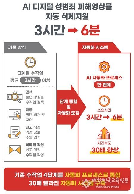 기존에는 삭제지원관이 영상물마다 모두 수작업으로 피해 영상물을 채증하고, 보고서를 작성해야 했기 때문에 많은 시간이 소요됐으나, 이제 디지털 성범죄 영상물의 모니터링부터 검출, 삭제까지 전 과정을 ‘AI 자동화’ 함으로써 처리속도를 30배 개선하는 성과를 기대할 수 있게 됐다.