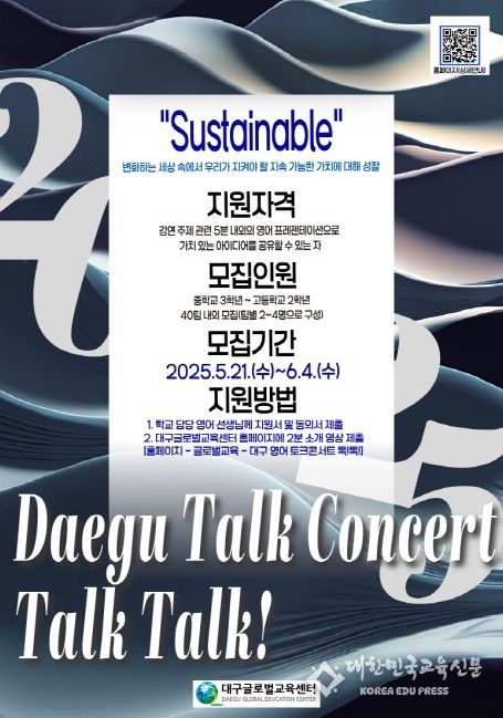 [대한민국교육신문] 대구교육연수원 산하 대구글로벌교육센터는 오는 11월 8일에 개최되는 ‘2025. 대구 영어 토크콘서트 톡!톡!’ 무대에 설 학생 연사를 5월 21일부터 모집한다고 밝혔다.