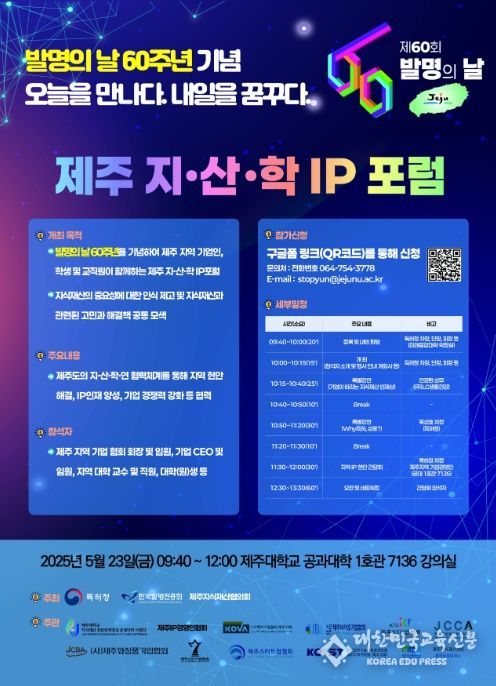 [대한민국교육신문] 특허청은 발명의 날 60주년을 기념하여 5월 22일~23일까지 제주대학교(제주시)에서 지식재산(IP) 중점대학 사업단장 간담회 및 제주 지‧산‧학 지식재산(IP) 포럼을 개최한다.