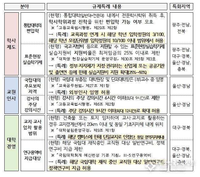 [대한민국교육신문] 교육부는 6월 9일부터 ‘대구‧경북’, ‘광주‧전남’, ‘울산‧경남’, ‘충북’, ‘전북’ 5개 고등교육혁신 특화지역을 변경지정하여, 총 12건(중복 제외 시 6건)의 규제특례를 새롭게 적용한다고 밝혔다.
