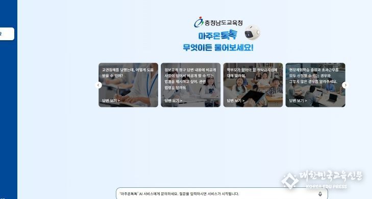 [대한민국교육신문] 충남교육청은 디지털 교육혁신을 위한 인공지능 기반의 '마주온 톡톡' 서비스를 11일부터 본격적인 운영에 들어간다. 특히, 이번 서비스는 전국 교육청 중 최초로 일반 사용자를 위한 민원과 업무 지원은 물론, 교직원에게는 네이버의 클로바X 생성형 인공지능(AI)을 제공하는 등 맞춤형 기능을 도입해 기대를 모으고 있다.