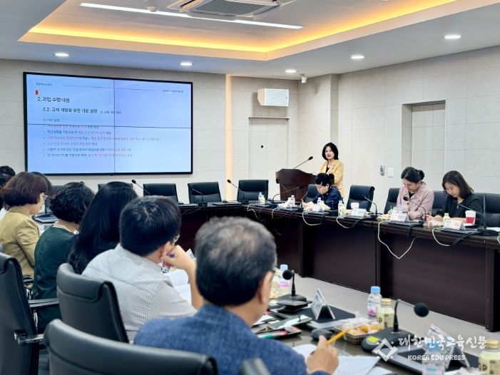 보고회에는 교육국장, 유초등교육과장, 국제교육원장 등 내부 위원과 함께 도내 대학 교수, 현직 교사 등 외부 전문가 20여 명이 참석한 가운데 추진 경과 보고, 연구 방향 발표, 질의응답 등의 순으로 진행됐다.