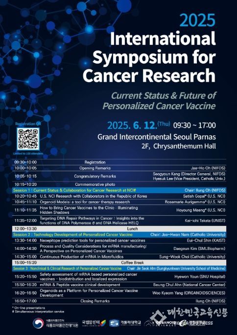 [대한민국교육신문] 식품의약품안전처 소속 식품의약품안전평가원은 ‘개인 맞춤형 치료용 암백신의 현재와 미래’를 주제로 ‘2025 국제 암연구 심포지엄(2025 International Symposium for Cancer Research)’을 6월 12일 그랜드 인터컨티넨탈 서울 파르나스에서 개최한다.