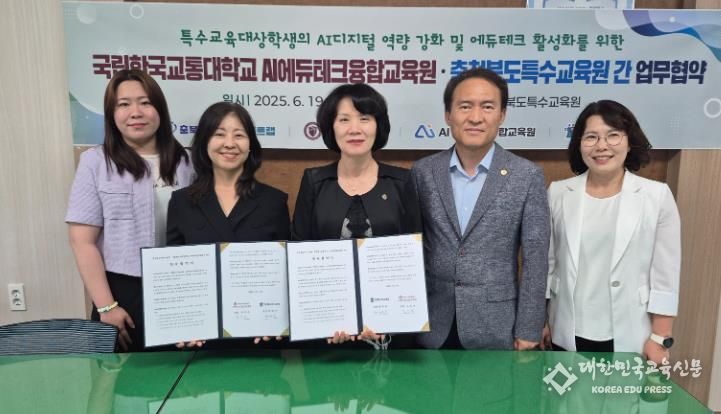 [대한민국교육신문] 충청북도교육청 직속기관 특수교육원은 19일, 국립한국교통대학교 AI에듀테크융합교육원과 특수교육대상학생의 AI디지털 역량강화 및 에듀테크 활성화를 위한 업무협약을 체결했다.