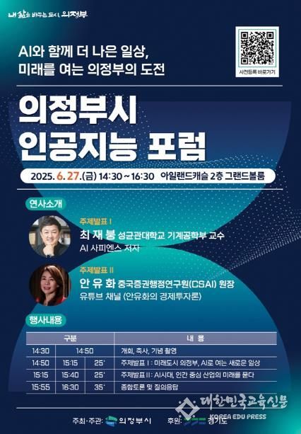 [대한민국교육신문] 의정부시는 6월 27일 오후 2시 30분 아일랜드캐슬 그랜드볼룸에서 ‘인공지능(AI)과 함께 더 나은 일상, 미래를 여는 의정부의 도전’이라는 주제로 인공지능 포럼을 개최한다.