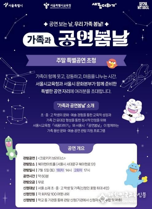 [대한민국교육신문] 서울특별시교육청이 서울시와 손잡고 교육취약학생과 그 가족을 위한 문화예술 관람 프로그램 ‘가족과 공연봄날’을 7월부터운영한다.