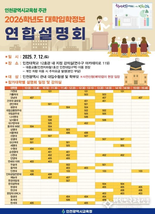 [대한민국교육신문] 인천광역시교육청은 7월 12일 수도권 및 지방권 36개 대학을 초청해 ‘2026학년도 대학입학정보 연합설명회’를 개최한다.