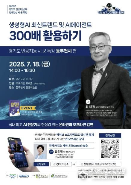 [대한민국교육신문] 동두천시는 오는 18일 오후 2시부터, 경기도와 경기도경제과학진흥원이 주최하고 동두천시와 성균관대학교가 주관하는 ‘생성형 인공지능(AI) 특별강연’을 동두천시 평생학습관에서 개최한다고 밝혔다.