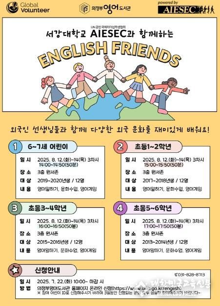 [대한민국교육신문] 의정부영어도서관은 8월 12일부터 14일까지 3일간 서강대학교 AIESEC(아이섹: UN 공인 국제리더십학생협회)과 협력해 글로벌 문화체험 영어교육 프로그램 ‘English Friends’를 운영한다.