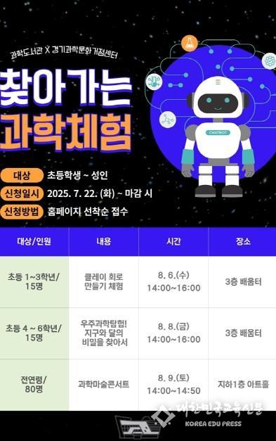 이번 프로그램은 8월 6일부터 9일까지 총 3회에 걸쳐 진행한다. 대상별 맞춤형 체험으로 구성해 ▲초등학생 1~3학년을 위한 ‘클레이 회로 만들기’ ▲초등학생 4~6학년을 위한 ‘우주과학 탐험’ ▲전 연령 누구나 참여 가능한 ‘과학마술콘서트’를 운영한다.