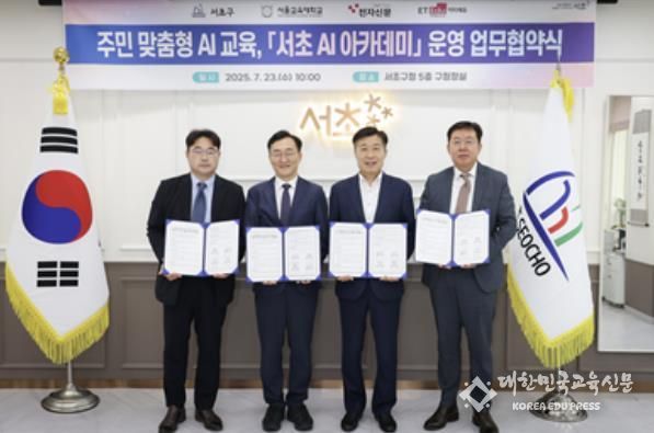 [대한민국교육신문] 서울 서초구는 23일, 인공지능(AI) 시대에 대응하는 주민 맞춤형 미래교육 모델을 구축하기 위해 서울교육대학교, 전자신문사, 이티에듀(주)와 함께 ‘서초 AI 아카데미’ 운영을 위한 업무협약(MOU)을 체결했다고 밝혔다.
