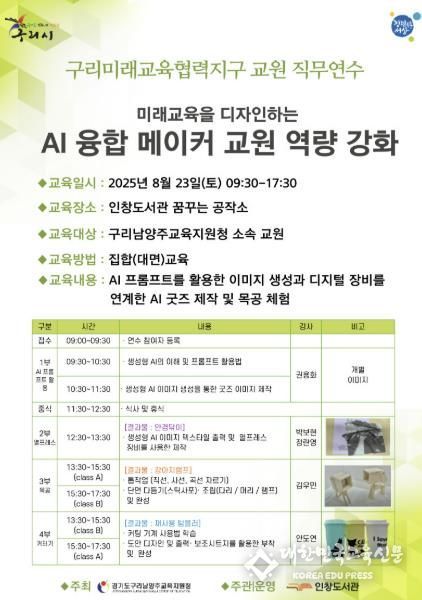 인창도서관 꿈꾸는 공작소는 전국 도서관 중 선도적으로 교육청과 협력하여 교원과 학생을 대상으로 메이커 교육 프로그램을 꾸준히 운영해 왔다. 오는 8월 23일에는 구리남양주교육지원청 소속 교원들을 대상으로 ‘미래 교육을 디자인하는 AI 융합 메이커 교원 역량 강화’직무연수를 운영하며, AI 기술과 메이커 활동을 융합한 교육 역량 강화에 나선다.