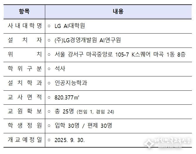[대한민국교육신문] 교육부는 ㈜엘지(LG) 경영개발원 에이아이(AI)연구원이 신청한 사내대학원인 ‘엘지(LG) 에이아이(AI)대학원(석사과정)’의 설치를 인가했다고 밝혔다.