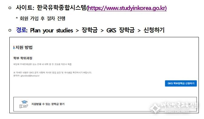 ‘정부 초청 외국인 장학사업(GKS, Global Korea Scholarship)’은 매년 전 세계 우수 인재를 초청하여 국내 학위(학·석·박사) 취득을 지원하는 우리나라 대표 장학사업으로, 사업이 시작된 1967년부터 현재까지 총 161개국 19,502명의 우수 인재를 선발‧지원해 왔다.