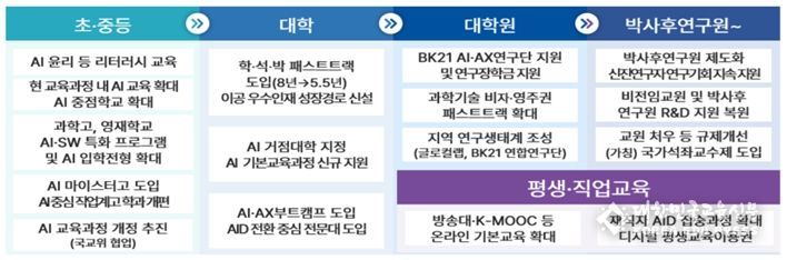 초‧중등 학생‧학부모 등을 대상으로 인공지능(AI) 교육을 실시하는 인공지능(AI) 교육지원센터를 2026년 3개 교육청에 우선 설립하고, 2028년까지 전국 17개 시‧도교육청 전체에 확대할 계획이다. 시‧도교육청-대학-기업이 함께 학교 인공지능(AI) 교육을 지원하도록 협력 체계 구축을 지원하며, 특히 학생들에게 다양한 인공지능(AI) 진로체험 기회를 제공할 예정이다.