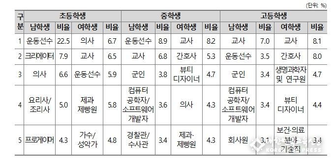 학교급별뿐만 아니라 성별 희망하는 직업에도 차이가 있었다. 교사는 초등학교 남학생을 제외한 모든 학교급의 성별에서 상위 5개 직업에 포함됐으며, 간호사는 중·고등학교 여학생의 희망직업에서 특히 높은 순위로 나타났다.