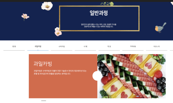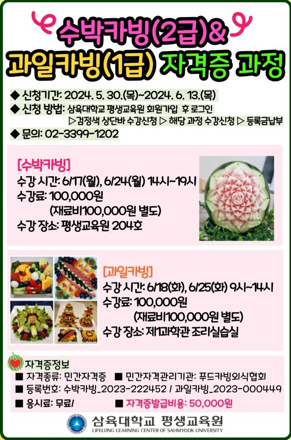 수강장소는 삼육대학교 평생교육원 제1과학관 조리실습실이며 교육이수후 수박카빙(2급), 과일카빙(1급) 자격증을 취득하게 된다.