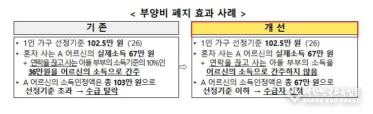 [대한민국교육신문] 내년 1월부터 26년 만에 의료급여 부양비 제도가 폐지된다. 이때 부양비는 실제로는 가족에게 부양받고 있지 않아도 가상의 소득을 지원받는다고 간주하는 제도이다. 의료급여는 수급자의 소득기준을 판단할 때 간주 부양비를 소득으로 반영해 현실에 맞지 않다는 비판을 받아왔다. 부양비가 폐지되면 그간 불합리했던 수급자격 문턱이 개선되어 비수급 빈곤층이 완화될 것으로 기대된다. 또한 의료급여 수급자들의 정신과 상담치료 접근성을 높이기 위한 외래 상담료 지원 횟수가 확대되고, 급성기 정신질환자의 초기 집중치료를 위한 수가도 인상된다. 하반기부터는 요양병원 중증 입원환자에 대한 간병비 지원이 추진될 계획이다. 또한 과다 외래 의료이용자에 대한 본인부담 차등제가 내년부터 본격 시행된다.