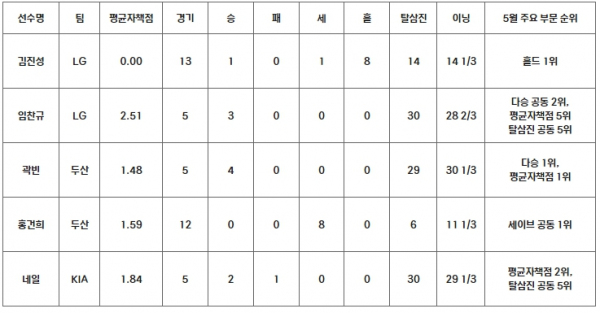 두산 곽빈은 등판한 5경기에서 4승을 달성하며 다승 부문 1위를 차지했다. 특히 3경기에서 19이닝을 던지는 동안 자책점을 허용하지 않아 평균자책점도 1.48로 단독 1위에 올랐다. 곽빈은 두산이 5월 한 달 동안 구간 성적 1위를 달릴 수 있는 상승세를 주도했다.