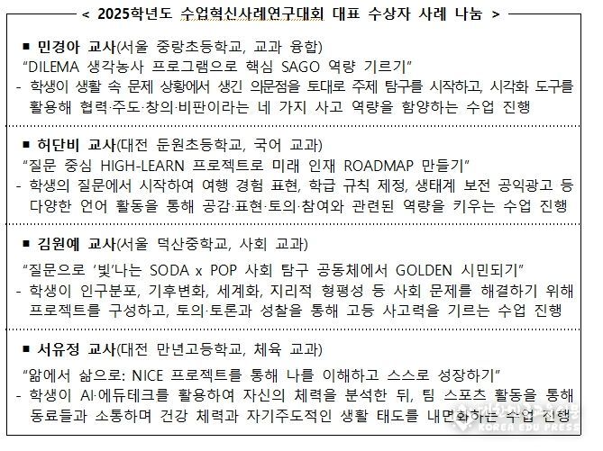이번 시상식은 지속적인 연구로 수업 혁신을 이끌어 온 교사들의 노력을 알리고, 수업 경험을 공유하며 우수 수업사례를 전국적으로 홍보・확산하기 위해 마련됐다.