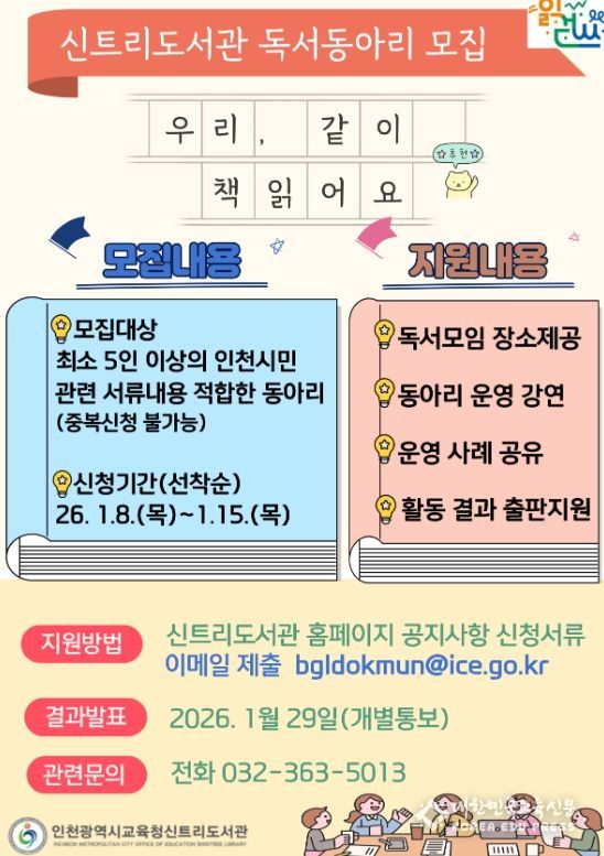 [대한민국교육신문] 인천광역시교육청신트리도서관은 시민 주도의 자율적인 독서 활동을 지원하고 생활 속 독서문화를 확산하기 위해 '2026년 자율독서동아리 지원사업'의 동아리를 모집한다.