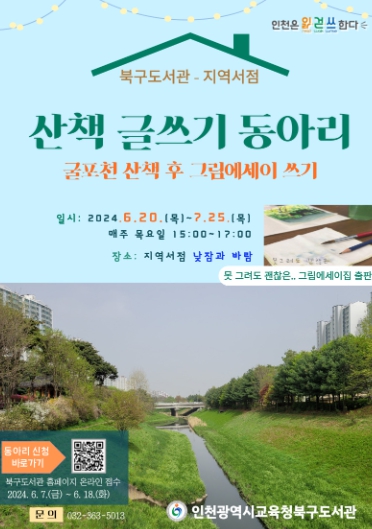 [대한민국교육신문] 인천광역시교육청북구도서관은 읽걷쓰 시민문화 운동 확산을 위해 지역 서점과 함께 ‘산책 글쓰기 동아리’를 6월 20일부터 7월 25일까지 총 6회 운영한다.