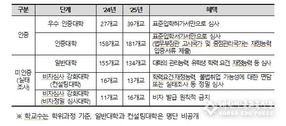 한편, 인증대학 외에 외국인 유학생이 1명 이상 재적 중인 대학에 대해서는 ‘유학생 유치‧관리 실태조사’를 실시하고, 일정 기준을 충족하지 못할 시 비자심사 강화대학(컨설팅대학, 비자정밀 심사대학)으로 지정했다. 이를 통해 대학이 외국인 유학생의 유치 단계에서 어학 능력과 재정 능력 등을 엄격히 심사하도록 하고, 유학생 관리 전반에 대한 대학의 책임을 강화할 예정이다.