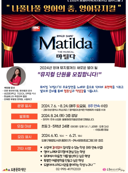 이번 영어무용스쿨은 전문 영어뮤지컬 강사와 함께 어린이 뮤지컬 ‘마틸다(Matilda)’의 주요 장면과 노래를 영어로 익히고, 이를 통해 문화적 배경과 다양한 영어표현을 습득하는 과정으로 기획됐다.