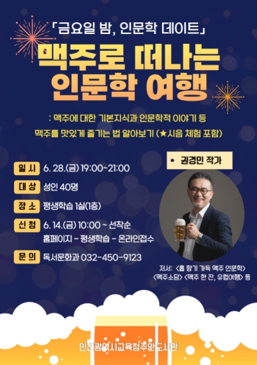 '금요일 밤, 인문학 데이트'는 1월부터 뮤지컬, 역사, 심리 등 다양한 주제로 운영했으며, 6월 강좌 주제는 ‘맥주로 떠나는 인문학 여행’이다. 이번 강좌를 통해 비어소믈리에 권경민 작가와 맥주에 대한 기본지식을 학습하고, 인문학적 이야기와 시음체험을 통해 시원한 여름 밤 맥주를 맛있게 즐기는 방법에 대해 알아본다.