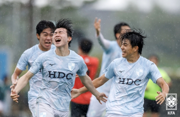 [대한민국교육신문] 8일 대한축구협회장배 8강에서 강원FCU18를 상대로 부산아이파크U18 오주안(왼쪽)이 득점을 터뜨린 후 기뻐하고 있다.