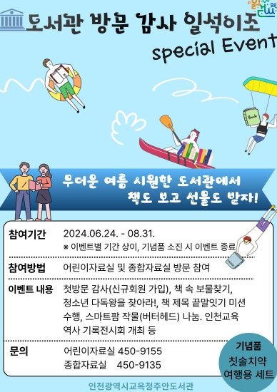 [대한민국교육신문] 인천광역시교육청주안도서관은 여름방학을 맞아 시민과 학생들을 대상으로 도서관 홍보와 참여를 위한 ‘도서관 방문 감사 일석이조 특별 행사’를 6월 24일부터 8월 31일까지 실시한다.