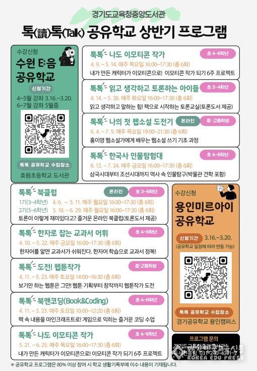 [대한민국교육신문] 경기도교육청중앙도서관이 학생들의 창의적 사고력과 진로설계 역량을 강화하기 위해 4월부터 7월까지 녪년 상반기 톡(讀)톡(talk) 공유학교’를 운영한다.