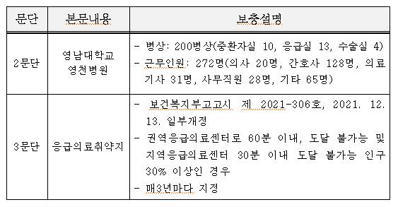 지역 종합병원의 안정적 유지와 지역 응급의료 역량 강화를 위한 재정적 지원은 지역 필수 의료체계 확립을 위해 불가결한 일로, 영천시는 영남대 영천병원 응급실 전문의 인건비로 6월 추경에 2억 원을 신청해, 총 5억 원을 지원할 예정이다.