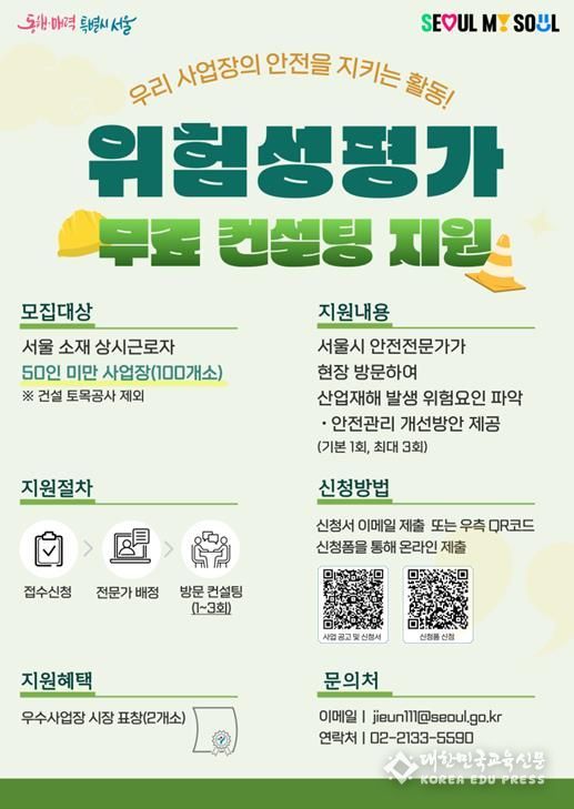 [대한민국교육신문] 서울시가 산업재해에 취약한 소규모 사업장의 안전관리 강화를 위해 ‘위험성평가 무료 컨설팅’ 지원에 나선다. 복잡한 제도와 인력 부족으로 위험성평가 이행에 어려움을 겪는 사업장을 대상으로, 전문가가 직접 현장을 찾아 실질적인 개선 방안을 제공한다.