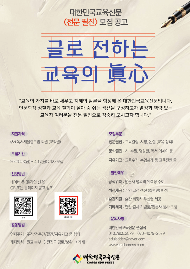 모집 분야는 교육 정책 및 현안을 다루는 ‘칼럼니스트’와 ‘논설위원’을 비롯해, 교단의 서정을 담은 ‘시·수필’, 내면의 성찰을 기록하는 ‘명상글’ 등이다. 선정된 필진은 신문사 측과 협의를 통해 주간, 격주간, 월간 또는 자유 기고 형태로 본인의 글을 지면에 게재하게 된다.