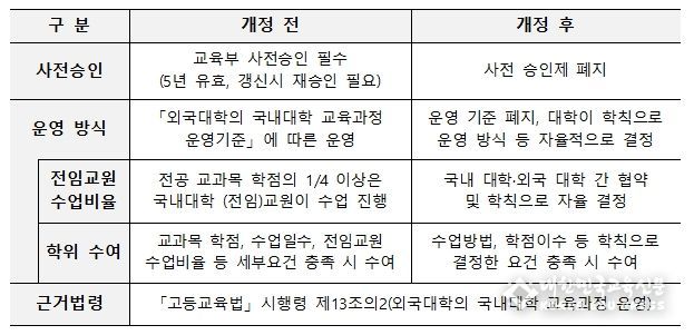 기존에는 국내 대학이 프랜차이즈를 운영하기 위해서 교육부의 사전 승인을 받아야 했으나, 2024년 2월 고등교육법 시행령 개정으로 대학 간 협약만으로도 운영이 가능해졌다. 교육과정의 구성과 수업 운영도 각 대학이 학칙으로 자율적으로 정할 수 있게 되어 현장에서 ‘프랜차이즈’ 운영의 추진력이 높아졌다.