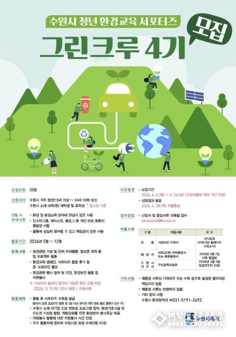 [대한민국교육신문] 수원특례시가 청년 환경교육 서포터즈 ‘그린크루 4기’ 35명을 4월 24일까지 모집한다.